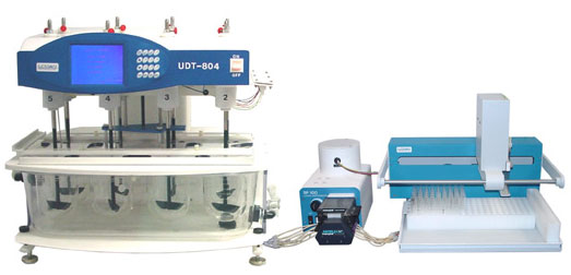 The SYSTEM 840 Automated Dissolution Sampling System is comprised of the LOGAN D-800 Automated Dissolution Tester, SCT-152 Sample Collector, and SP-100 Peristaltic Pump. These modules are controlled by a "Touch Screen" Programmable Controller, and up to 7 sets of test protocols can be stored. An advanced model is also available with an IBM-compatible PC control system.
